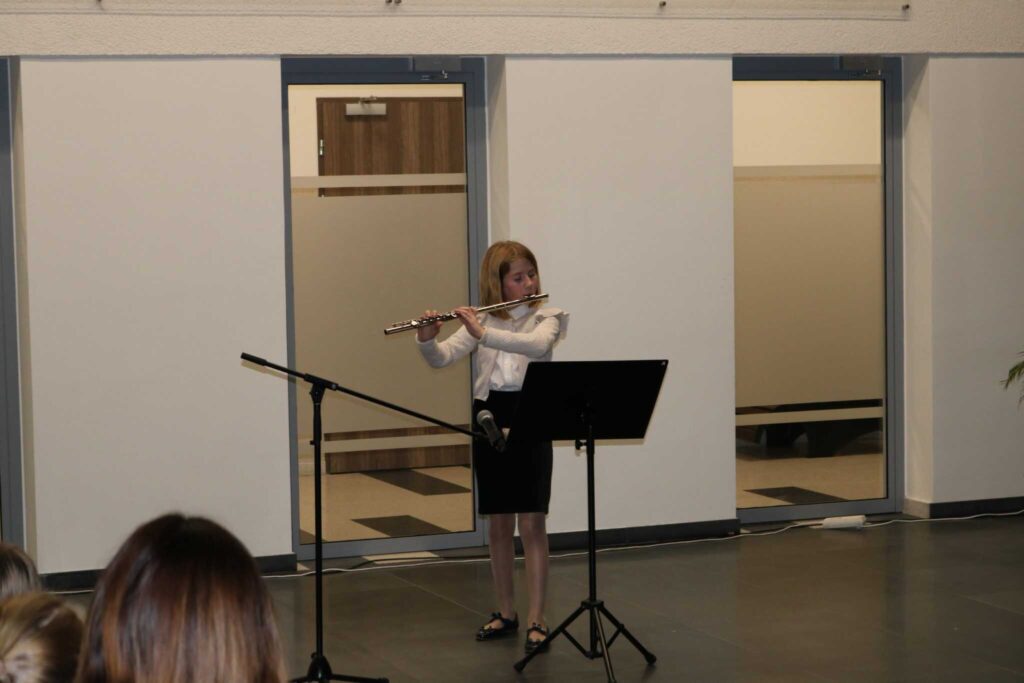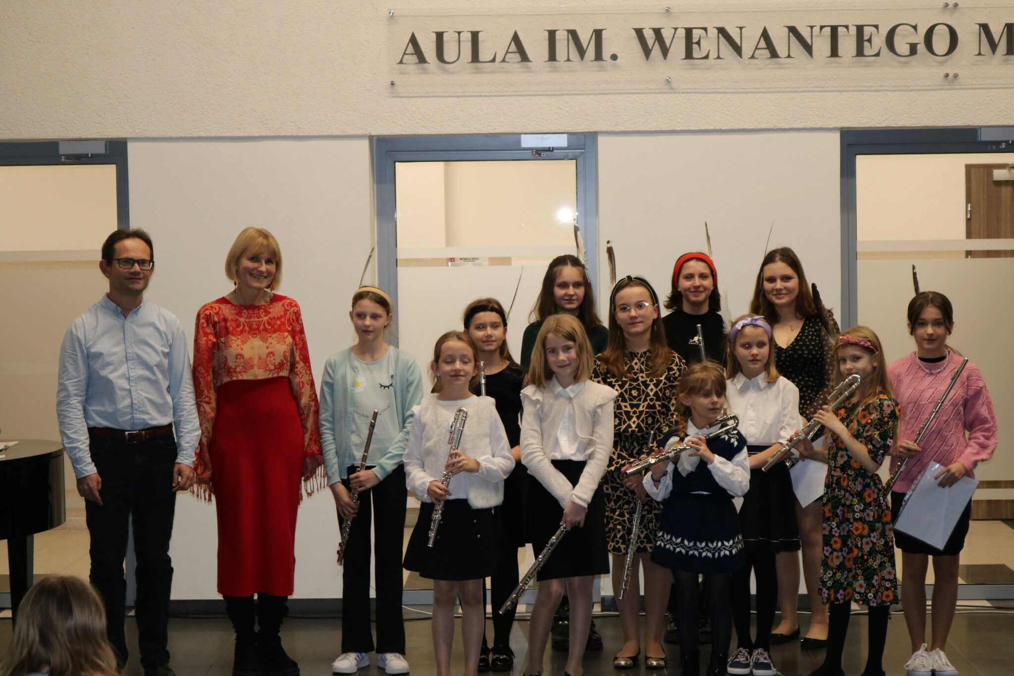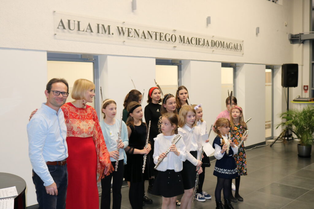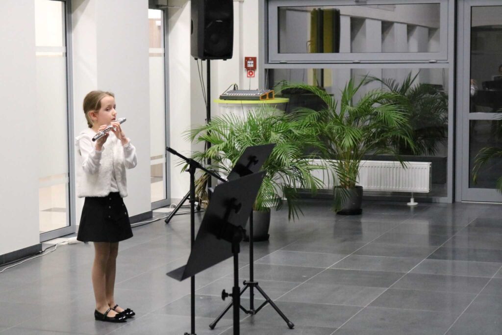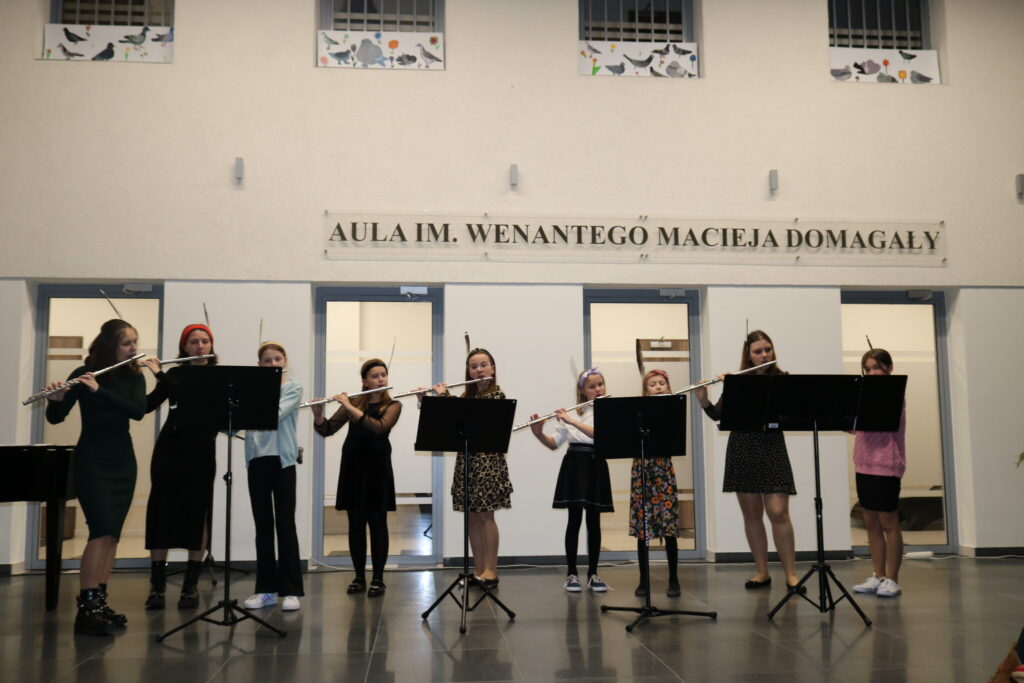 W dniu 22.11.2022 odbyła się audycja klasy fletu pani Beaty Kierzkowskiej pt. “Jesienne pejzaże muzyką fletowa malowane”. Wszyscy goście przybyli na audycję z wielką uwagą i zainteresowaniem słuchali przepięknych wykonań młodych artystek, a każde z nich było nagradzane oklaskami. Tego wieczoru mogliśmy usłyszeć min.: ”Deszczyk”, ”Hallowen Dance” jak również utwory na różne zespoły intrumentalne i wokalno- intrumentalne min.: ”Tosia i liście”, ”Jesienna zabawa”, ”Taniec żyrafy”, ”Kasztany”. Finał audycji to wspólne wykonanie utworu ”Le Grand Sitting Bull”. Było dużo radości, pięknych dźwięków i wspólnego muzykowania. Uczennicom akompaniował pan Jacek Nazarczuk.