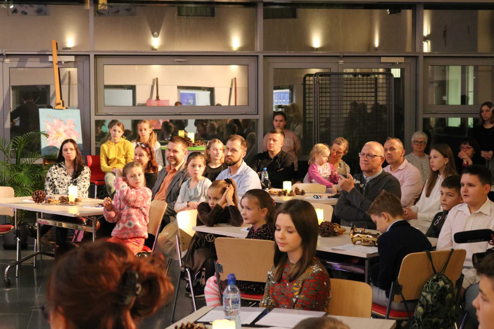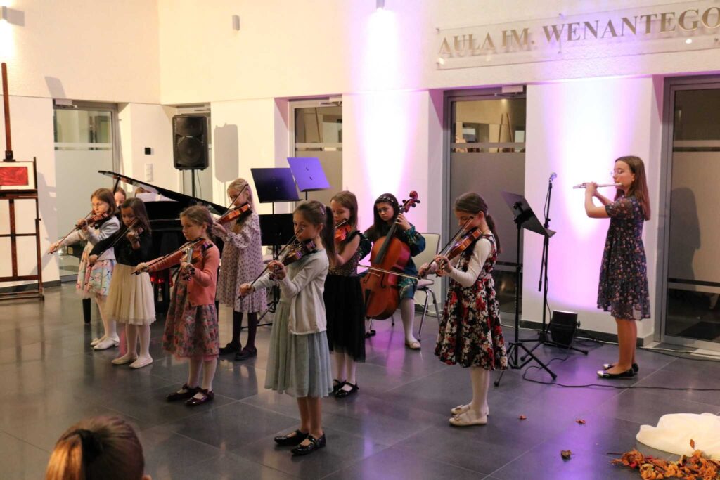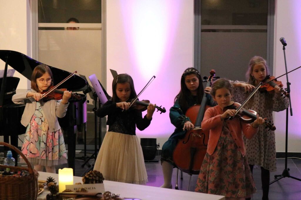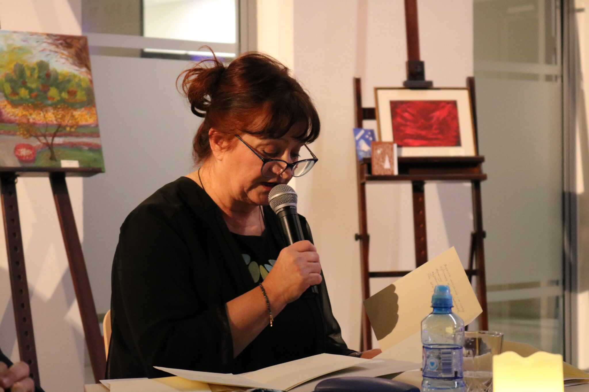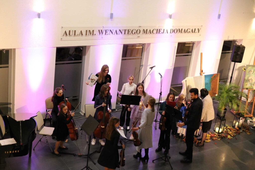 W otwarcie wystawy aktywnie włączyła się cała społeczność naszej szkoły zarówno uczniowie jak i nauczyciele. Wielu z nich recytowało wiersze Pani Bożeny na przemian z autorką. Liczna grupa uczniów zagrała utwory ubogacając muzyką treści obrazów i wierszy. Spotkanie było niezwykle pouczającą lekcją o wzajemnym przenikaniu się dziedzin artystycznych, a także o tym, że te same treści mogą tkwić w różnych dziedzinach sztuki o osobliwych formach wyrazu.