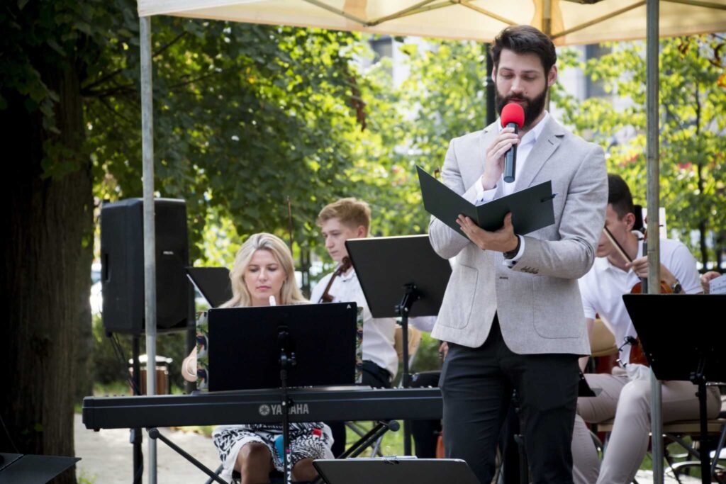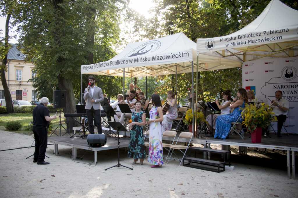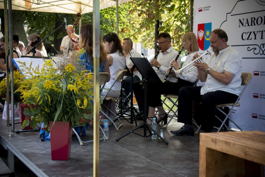 W ciepłe sobotnie popołudnie 9 września 2023 roku na skwerze przy placu Kilińskiego Miejska Orkiestra Kameralna pod dyrekcją Wenantego Macieja Domagały wystąpiła z okazji ogólnopolskiej akcji “Narodowe Czytanie”, której gościem specjalnym była wspaniała aktorka pani Olga Bończyk. Przygotowany przez orkiestrę repertuar nawiązywał do epoki, w której żyła i tworzyła bohaterka tegorocznej 12 edycji – Eliza Orzeszkowa. Próbując zbliżyć się do czasów opisanych w „Nad Niemnem” orkiestra wykonała m.in.: Poloneza „Pożegnanie Ojczyzny”, utwór „Polskie drogi” czy „Kwiaty polskie”. Na zakończenie wybrzmiała pieśń „Rośniemy razem z tą ziemią”. Z zespołem wystąpili soliści: pani Zofia Noiszewska, pani Monika Pszkit oraz pan Tomasz Osica, który jednocześnie prowadził koncert.