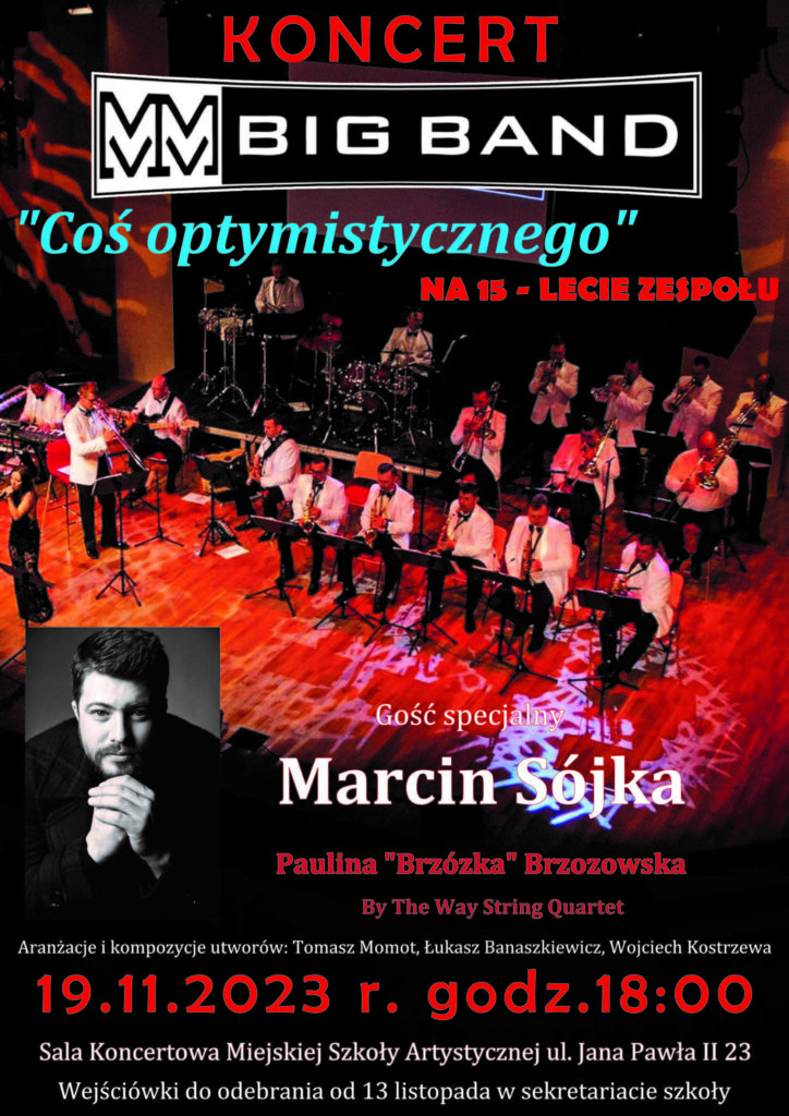 Pod takim tytułem w niedzielę 19 listopada odbył się koncert MM Big Bandu działającego przy naszej szkole. Z okazji 15-lecia istnienia zespołu muzycy przygotowali ponad półtorej godzinną iście muzyczną ucztę dla przybyłej publiczności, która wypełniła salę koncertową do ostatniego miejsca. Tym razem podczas występu można było oglądać piękne wizualizacje i prezentację opowiadającą historię zespołu. Specjalnie przygotowane na tę okazję aranżacje wprawiły publiczność we wspaniały nastrój, która śpiewała wraz z artystami znane utwory. Tego wieczoru można było usłyszeć kompozycje z repertuaru Zbigniewa Wodeckiego, Krzysztofa Krawczyka, Seweryna Krajewskiego i wielu innych znanych artystów. Zabrzmiały również standardy muzyki jazzowej, a nawet muzyka klasyczna. Muzycy podzielili się z publicznością muzycznymi prezentami, które zespół z okazji 15-lecia otrzymał od innych artystów. Jednym z nich była aranżacja “Marsza Tureckiego” od Adama Sztaby, a kolejnym, humorystyczny aranż “The Entertainer” od Łukasza Banaszkiewicza. Na scenie oprócz MM Big Bandu wystąpił kwartet smyczkowy By The Way String Quartet, który tym razem był w podwójnej obsadzie. Solistką była Paulina”Brzózka” Brzozowska, a gościem specjalnym koncertu był zwycięzca IX edycji The Voice of Poland – Marcin Sójka, który wykonał między innymi swój utwór pt.”Zaskakuj mnie” w odmienionej aranżacji. Były gratulacje, życzenia, kosz prezentów i kwiaty, a publiczność nagodziła artystów długą owacją na stojąco. Zespołowi życzymy kolejnych pięknych jubileuszy i radości ze wspólnego grania. Koncert przygotował i prowadził bandleader zespołu – Arkadiusz Mizdalski.