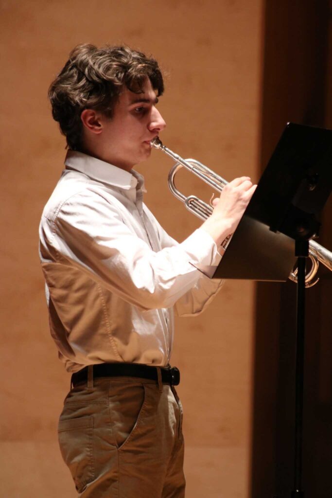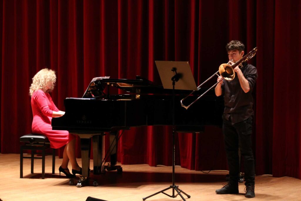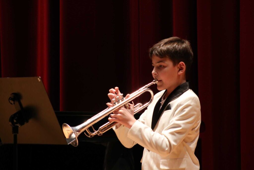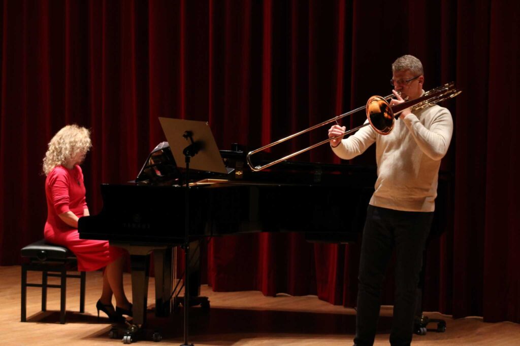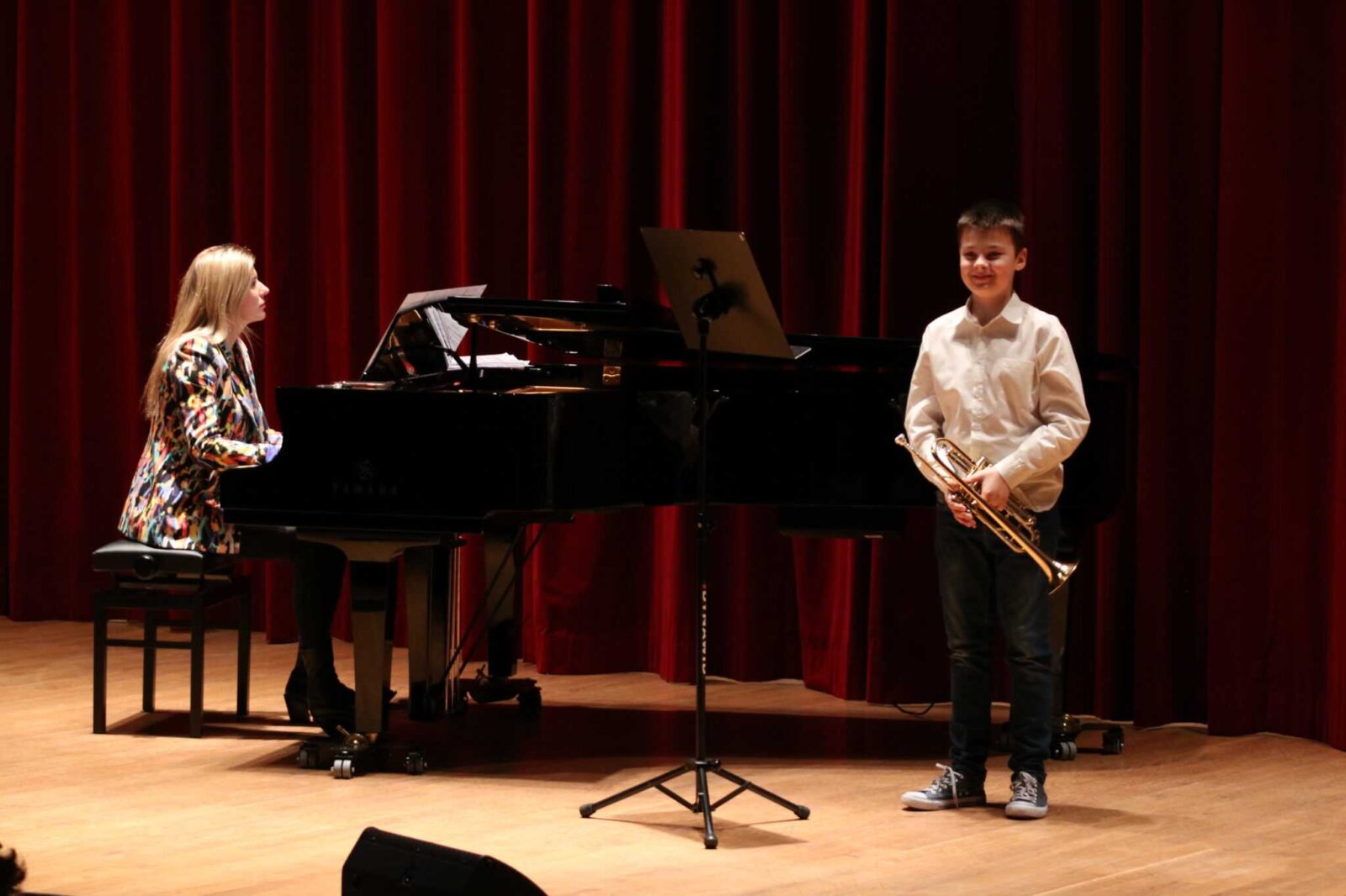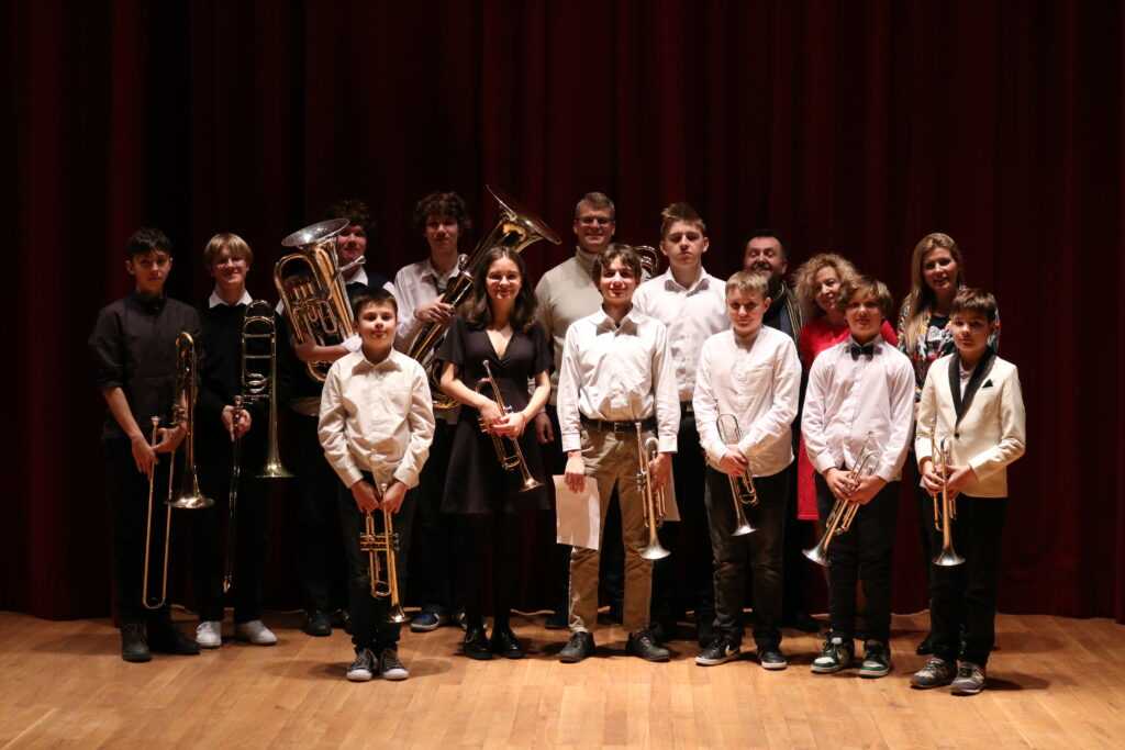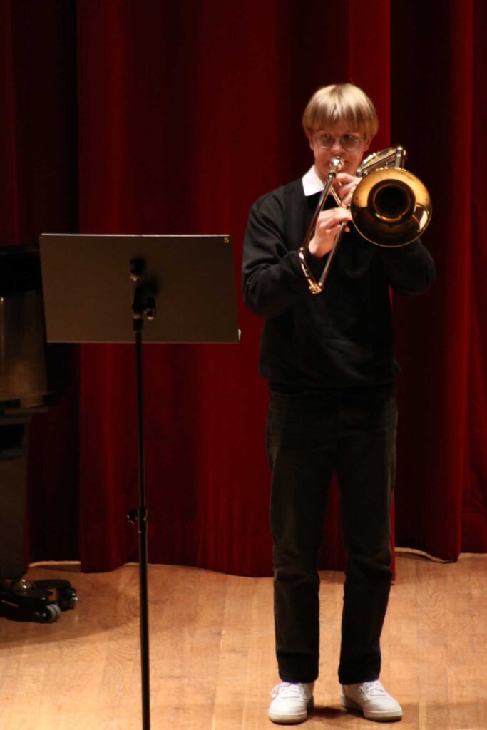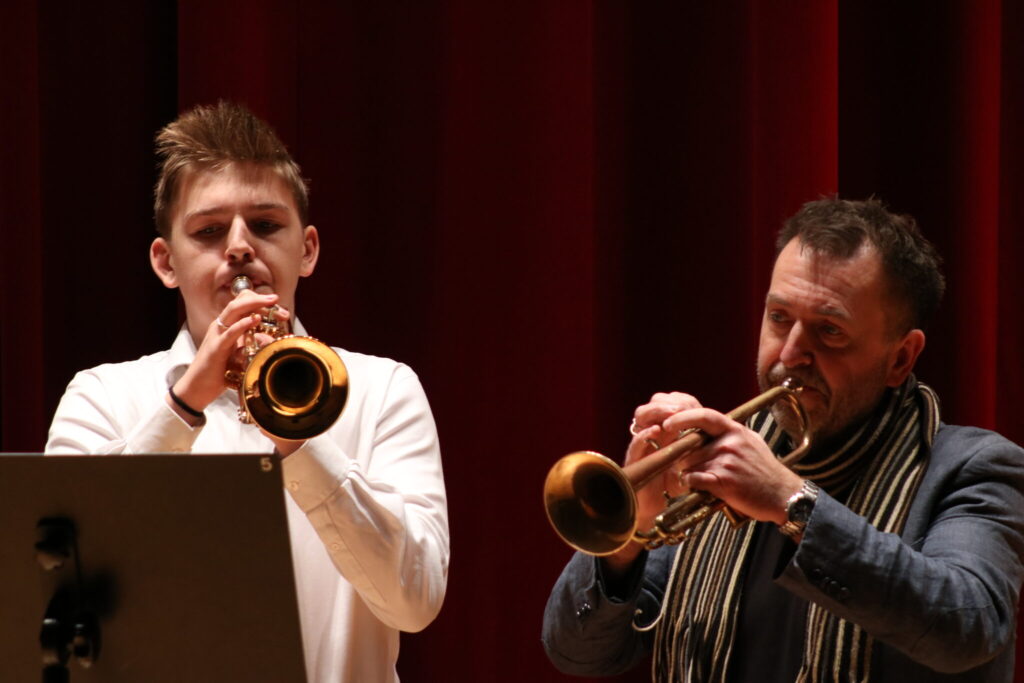 W poniedziałek 8 stycznia na scenie sali koncertowej naszej szkoły można było usłyszeć młodych artystów z klasy trąbki p. Wojciecha Ziółkowskiego i klasy puzonu i tuby p. Arkadiusza Mizdalskiego. Była to audycja podsumowująca pracę uczniów w I semestrze. Tego wieczoru można było usłyszeć utwory z różnych epok d baroku do muzyki współczesnej. Uczniowie wystąpili solo, z towarzyszeniem fortepianu, a nawet był też jeden duet uczeń i nauczyciel. Tradycją audycji tych dwóch klas jest to, że oprócz uczniów biorą w niej udział również nauczyciele więc i oni, dając przykład swoim podopiecznym, też przygotowali swoje utwory. Wśród publiczności były przede wszystkim rodziny uczniów i znajomi ale można też było zobaczyć uczniów z innych klas naszej szkoły, którzy z zaciekawieniem przyszli posłuchać pięknych wykonań. Na fortepianie akompaniowały p. Anna Kornacka i p. Tatiana Żarek.