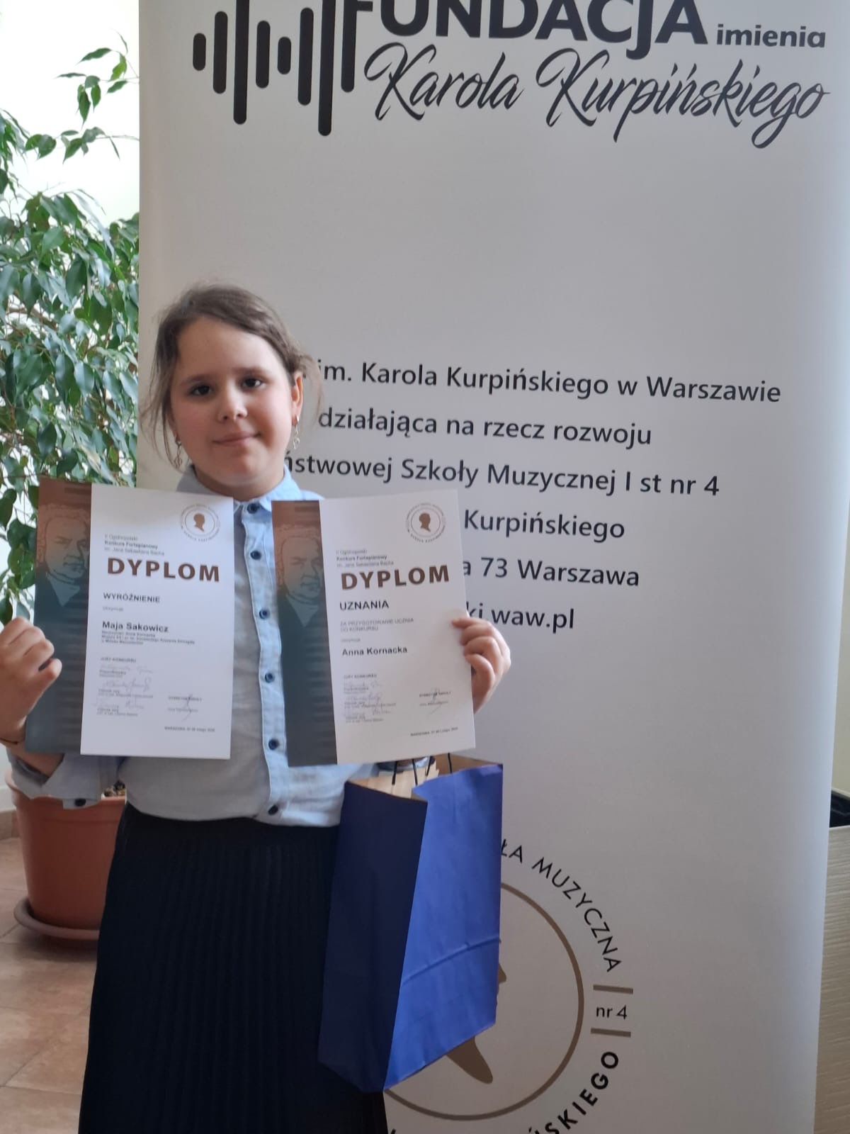 Maja Sakowicz, uczennica klasy fortepianu p. Anny Kornackiej, zdobyła wyróżnienie w II Ogólnopolskim Konkursie Fortepianowym im. Jana Sebastiana Bacha, który odbył się w dniach 27-28 lutego br. w Warszawie, w Państwowej Szkole Muzycznej im. Karola Kurpińskiego. Maja wykonała dwa utwory Jana Sebastiana Bacha- Trio z Menueta g- moll wg J. G. Stolza oraz Inwencję dwugłosową a -moll nr 13.